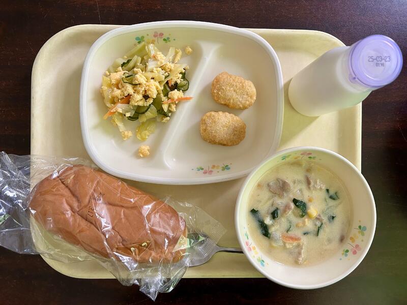 ミルクパン、牛乳、チキンナゲット、ミモザサラダ、コーンスープです。