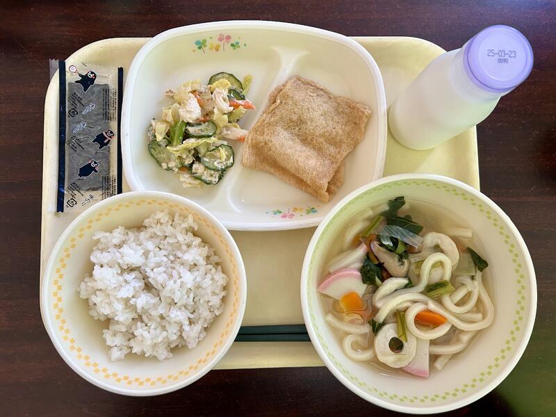 麦ごはん(少なめ)、牛乳、南関揚げのきつねうどん、ささみのごまだれサラダ、味のりです。