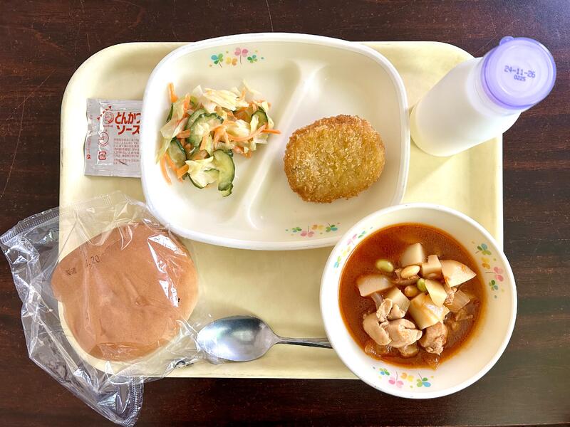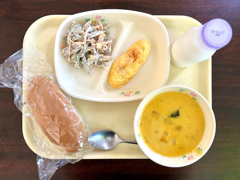 今日は、コッペパン、牛乳、トマトオムレツ、ごぼうサラダ、かぼちゃの米粉シチューです。