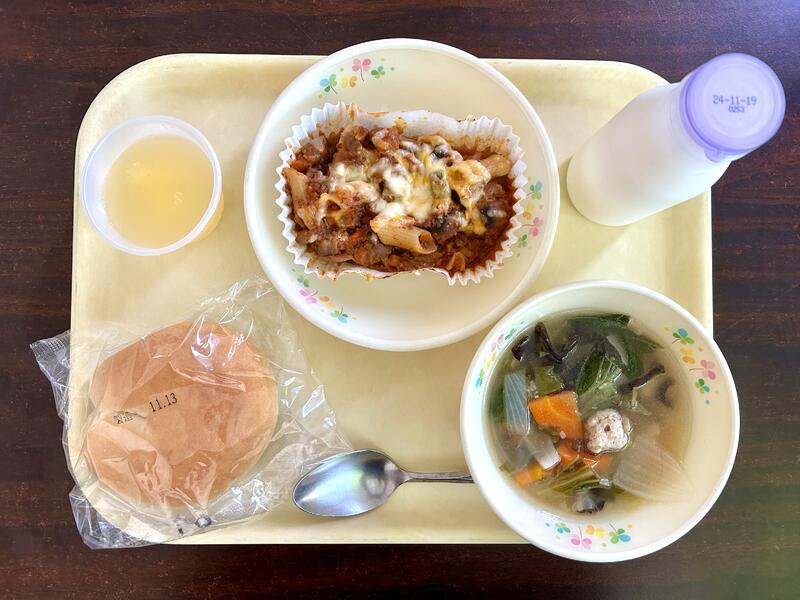 今日は、米粉パン、牛乳、なすのペンネグラタン、チンゲン菜と肉団子スープ、りんごかもしれないゼリー