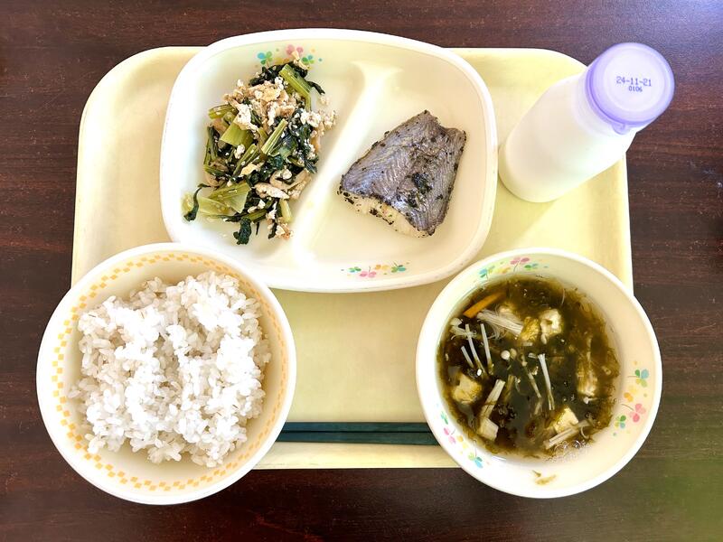 今日は、麦ごはん、牛乳、魚のハーブ焼き、小松菜と油揚げのごま炒め、あおさ汁です。