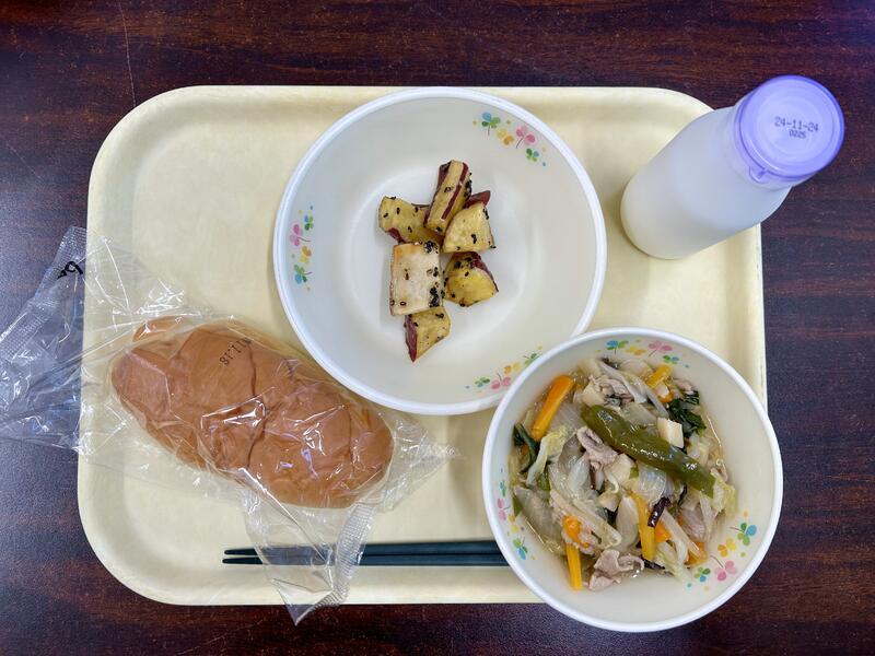 今日は、ミルクパン、牛乳、八宝菜、大学芋です。