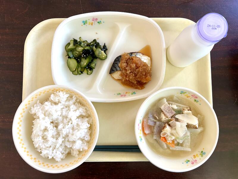 ごはん、牛乳、さばのおろし煮、きゅうりとわかめの酢の物、豚汁です。