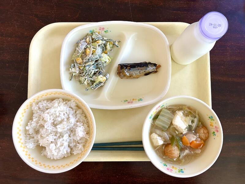むぎごはん、牛乳、さんまの生姜煮、茎わかめのマヨサラダ、水炊きです。