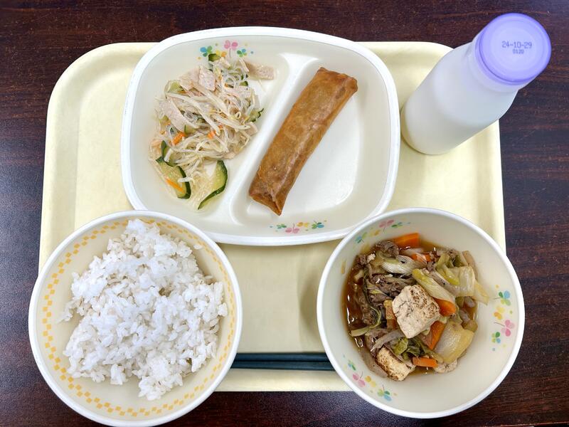 今日は、むぎごはん、牛乳、米粉入り春巻き、バンサンスー、肉豆腐です。