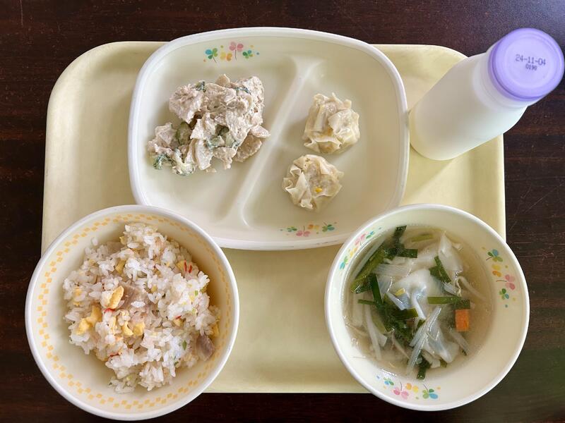 今日は、たまごチャーハン、牛乳、コーンシューマイ、れんこんツナサラダ、ワンタンスープです。