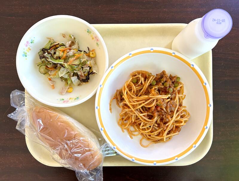 ミルクパン、牛乳、おひさまいろのスパゲッティ、りっちゃんのサラダです。