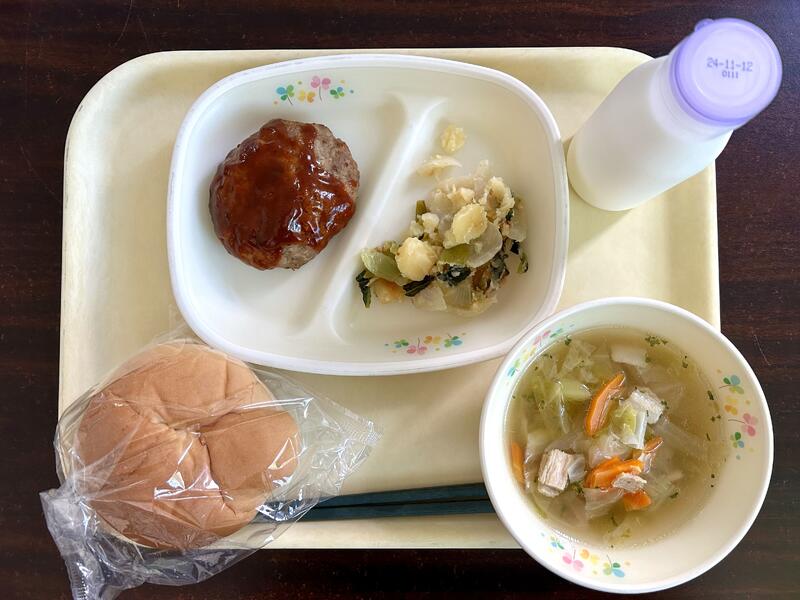 今日は、絵本給食の第3弾で、ぐりとぐらのハンバーグパン、牛乳、にんにくバターの野菜炒め、キャベツのコンソメスープです。