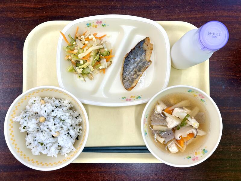 今日は、大豆わかめごはん、牛乳、さわらの西京焼き、ピーナツ入りかみかみサラダ、けんちん汁です。
