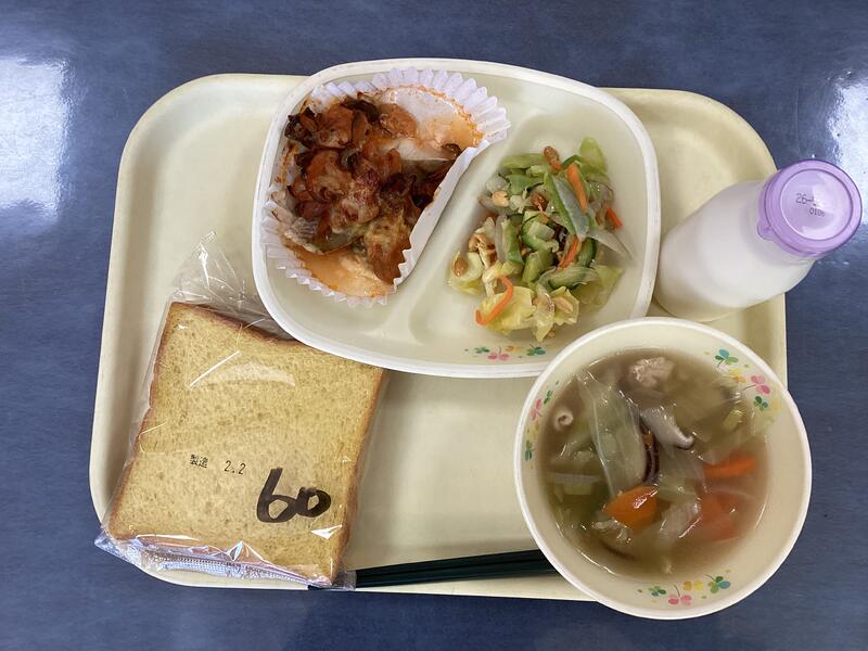 米粉入りかぼちゃパン、牛乳、魚のピザ焼き、ピーナッツ入りかみかみサラダ、コンソメスープ です。