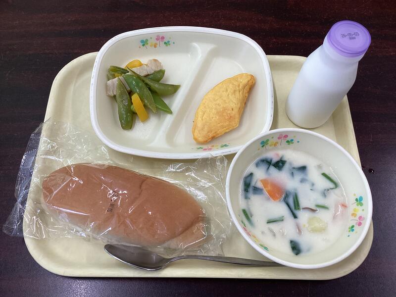 コッペパン 牛乳 トマトミートオムレツ スナップえんどうのソテー ほうれん草のクリームスープ