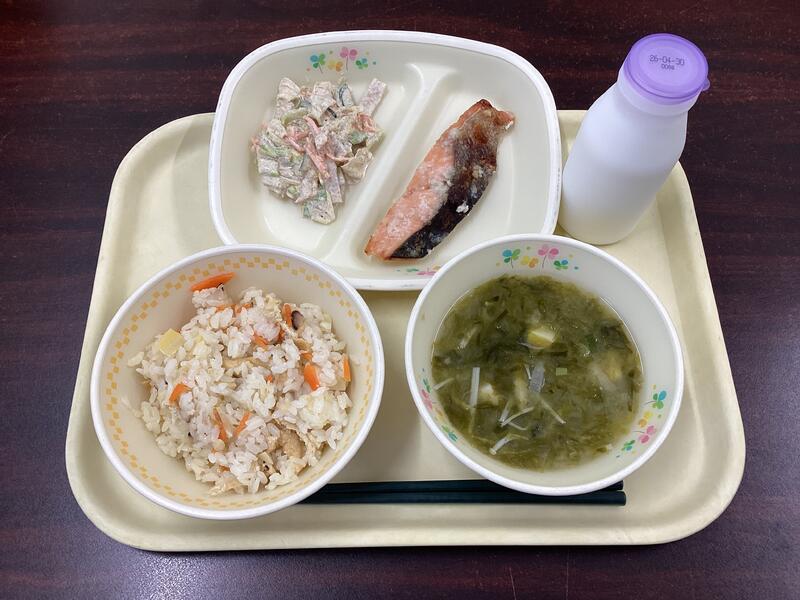 たけのこごはん 牛乳 鮭の塩こうじ焼き キャベツのゴマヨネーズ和え あおさのみそ汁