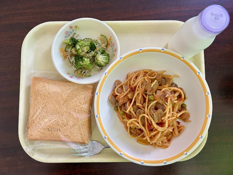 熊本県産トマトパン、牛乳、はちべえトマトのクリームスパゲティ、ブロッコリーとじゃこのあえものです。