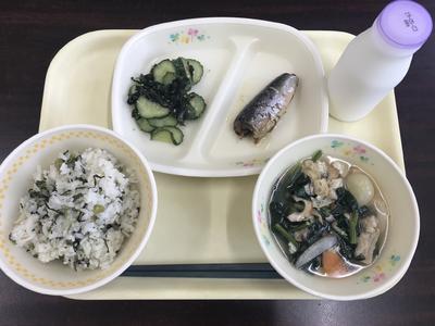 高菜めし 牛乳 だご汁 いわしの甘露煮 きゅうりとわかめの酢の物