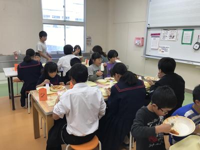 今日のハヤシライスにはたまねぎを14キロ入れています。トマトもたっぷり入れたので、トマトの酸味、甘味があるハヤシライスでした。中学生にはいただきますをして10分経たずに食器が空っぽになっている子どももいました。「カレーは飲み物」ならず「ハヤシライスも飲み物」でしょうか…。それだけおいしかったということなのでしょうが、しっかり噛んで食べてほしいものです(^ ^;)また、今日は交流給食の様子を一緒にアップします。