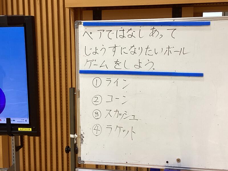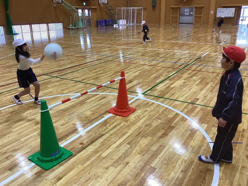 1~2年生の体育です。今日は、ペアで話しあって、上手になりたいボールゲームをします。