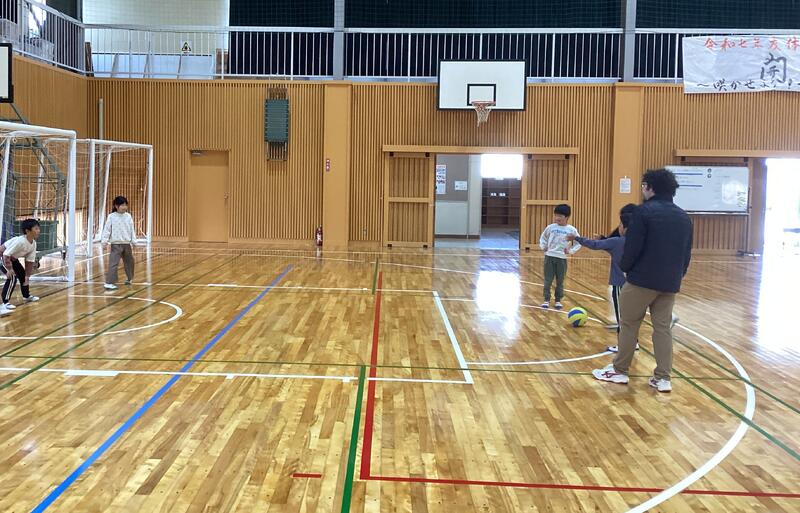 ALTの〇〇先生と1~2年生が体育館で一緒に遊んでいます☆