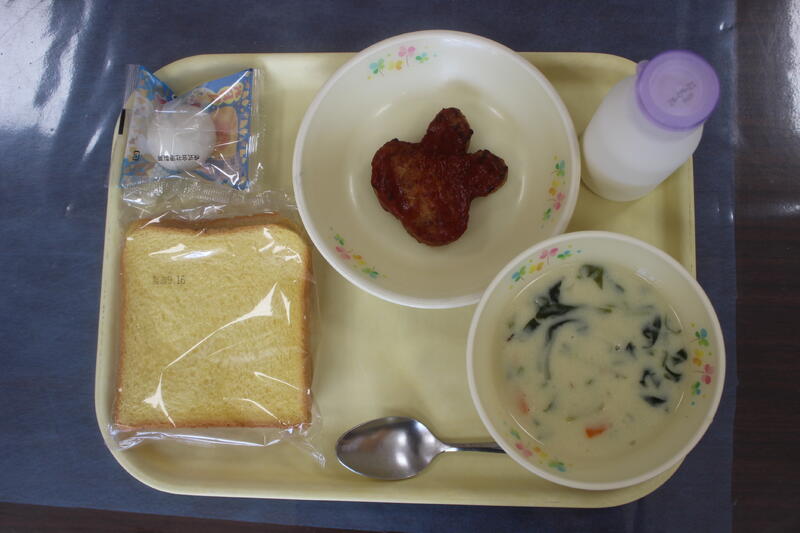 今日の献立は、お月見メニューです。牛乳、米粉入りにんじんパン、おつきみだんご、うさぎ型のハンバーグ、ほうれんそうのクリームスープです。