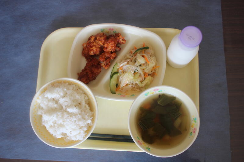 今日の献立は、韓国の味めぐりメニューです。むぎごはん、牛乳、中華スープ、バンサンスー、ヤンニョムチキン です。