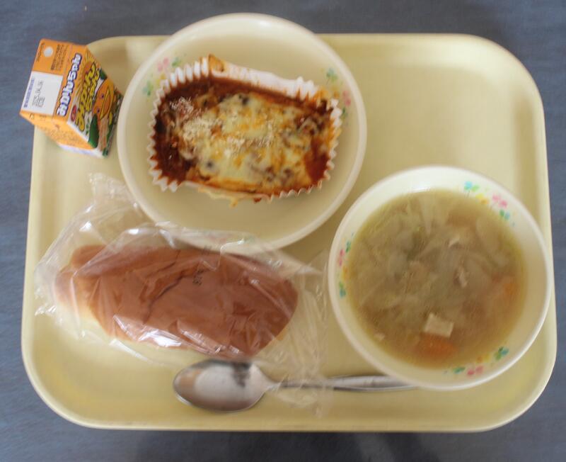 今日の献立は、みかん果汁ジュース、コンソメスープ、なすのミートグラタン、ミルクパン です。