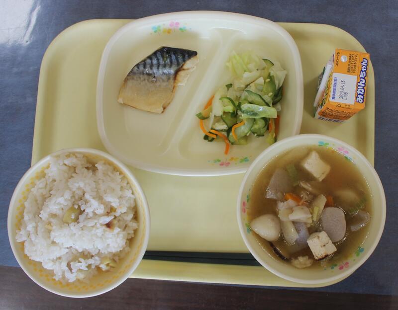 みかん果汁ジュース、つぼんじる、くりごはん、さばのしおやき、やさいのあまずあえ です。