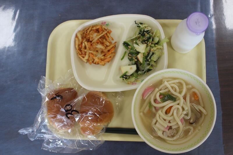 今日の献立は、牛乳、野菜かき揚げうどん、りんごとほうれんそうサラダ、バターロール です。
