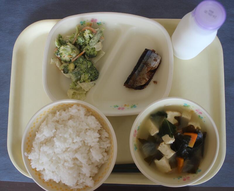 今日の献立は、牛乳、ごはん、あつあげとチンゲンサイのみそ汁、さんまおかかに、ブロッコリーのマヨサラダ です。