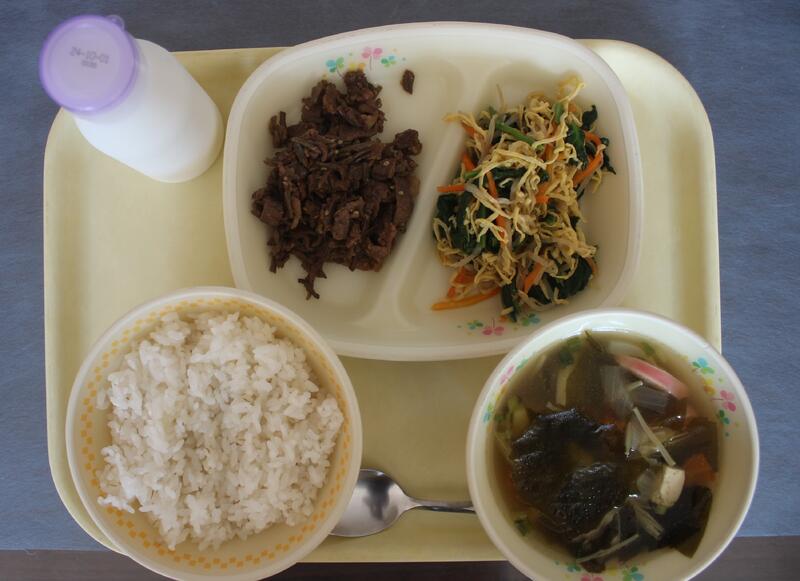 今日の献立は、牛乳、ビビンバ、錦糸卵入りほうれん草のナムル、むぎごはん、わかめスープ です。