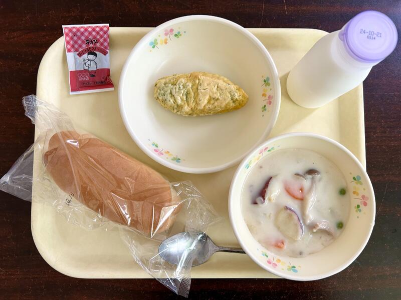 今日の給食は、コッペパン、牛乳、ほうれん草オムレツ、秋野菜のシチュー、マーシャルビーンズです。