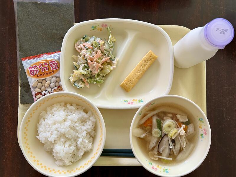 セルフ恵方巻(あつやきたまご)、牛乳、ツナサラダ、鶏ごぼう汁、節分豆です。