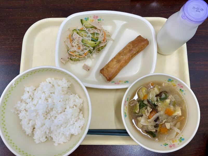 いかの中華丼、牛乳、春巻き、バンサンスーです。