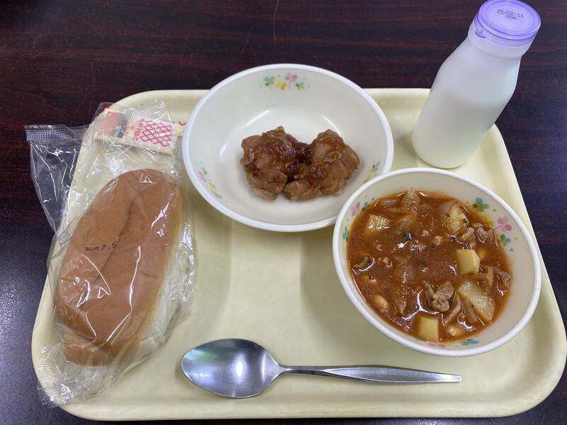 豚肉と里芋のカレーライス、牛乳、ブロッコリーナッツサラダ、ポンデチョコドーナツです。