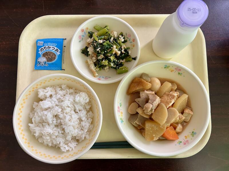 麦ごはん、牛乳、みそおでん、小松菜と油揚げのごま炒め、ふりかけです。
