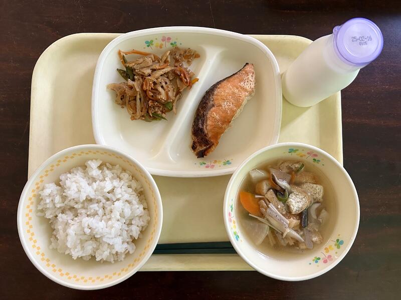 むぎごはん、牛乳、鮭のしおこうじ焼き、れんこんのきんぴら、たぬき汁です。