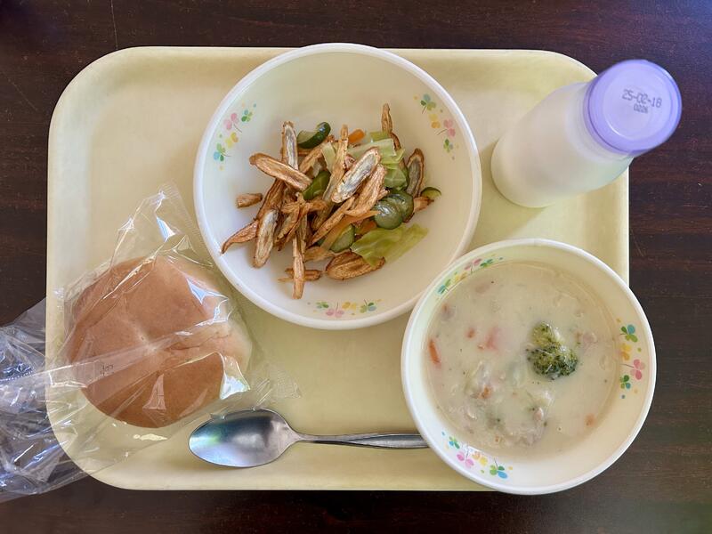 米粉パン、牛乳、豆乳チャウダー、ごぼうチップスサラダです。