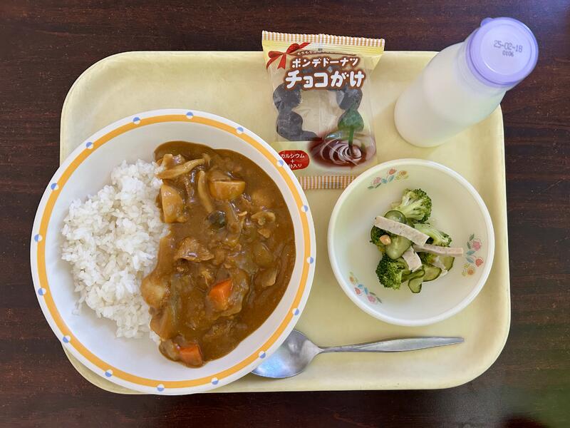 豚肉と里芋のカレーライス、牛乳、ブロッコリーナッツサラダ、ポンデチョコドーナツです。