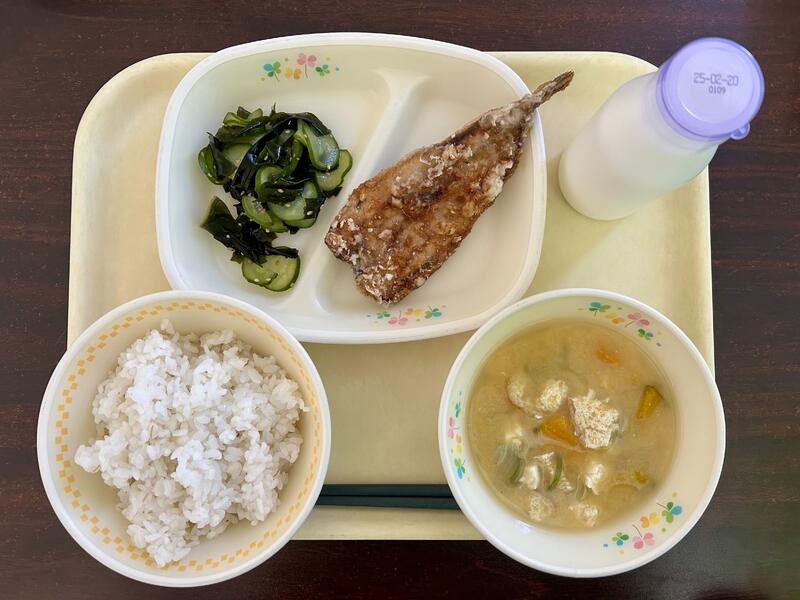 むぎごはん、牛乳、いわしのかばやき、きゅうりとわかめの酢の物、かぼちゃのみそ汁です。