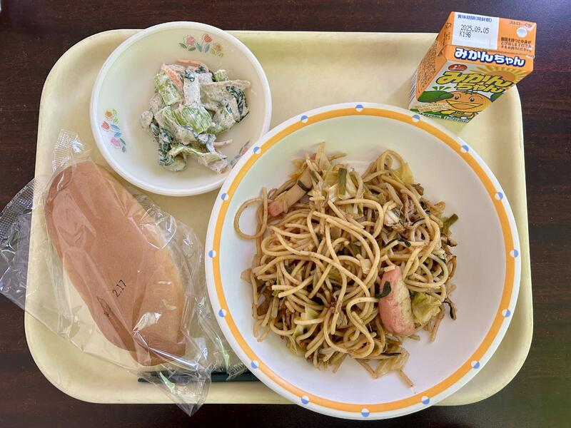 コッペパン、みかんジュース、ソース焼きそば、チンゲン菜のごまネーズあえです。