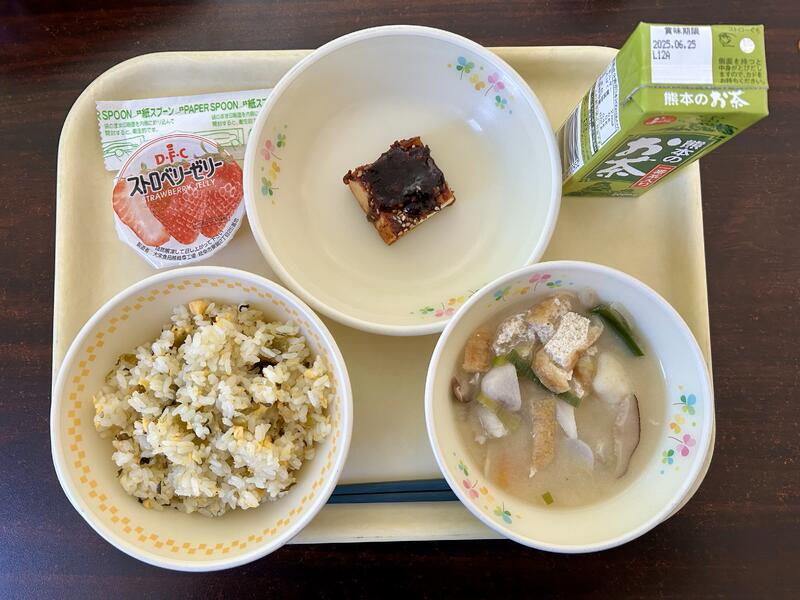 たかなごはん、牛乳、厚揚げの田楽、だご汁、いちごゼリーです。
