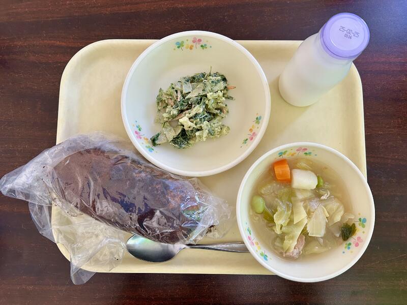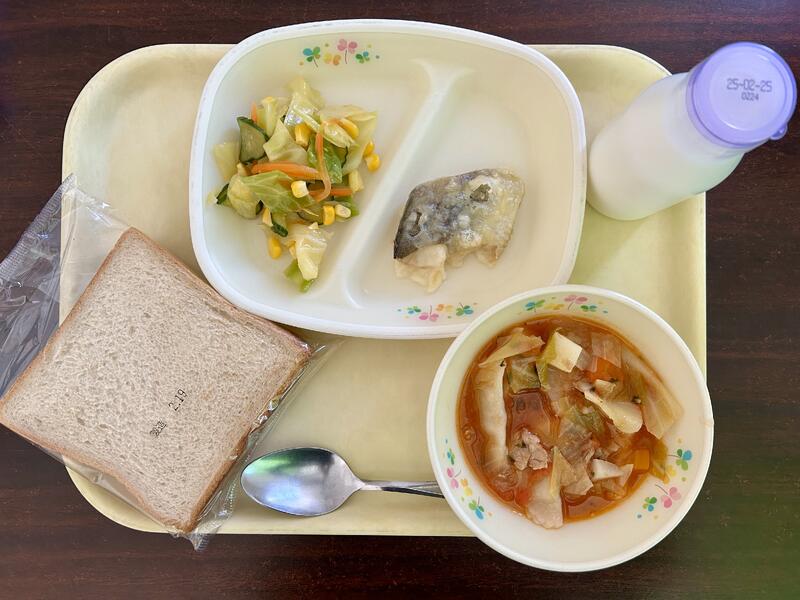黒糖パン、牛乳、たらのムニエル、コーンサラダ、ラビオリスープです。