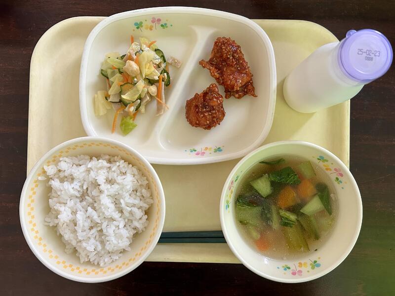 むぎごはん、牛乳、ヤンニョムチキン、カシューナッツあえ、チンゲン菜の中華スープです。