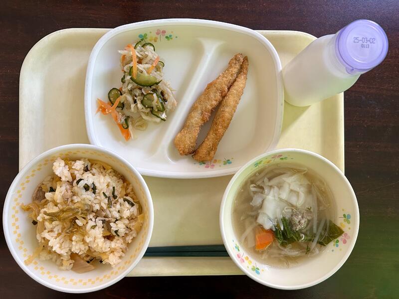 キムタクごはん、牛乳、ししゃもフライ、切り干し大根の酢の物、ワンタンスープです。