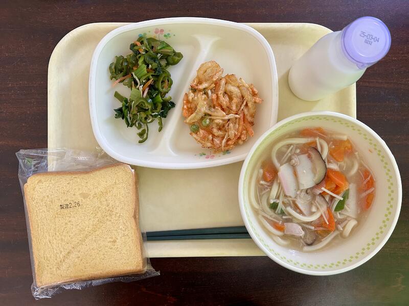 米粉入りにんじんパン、牛乳、野菜かきあげうどん、ピーマンのじゃこあえです。