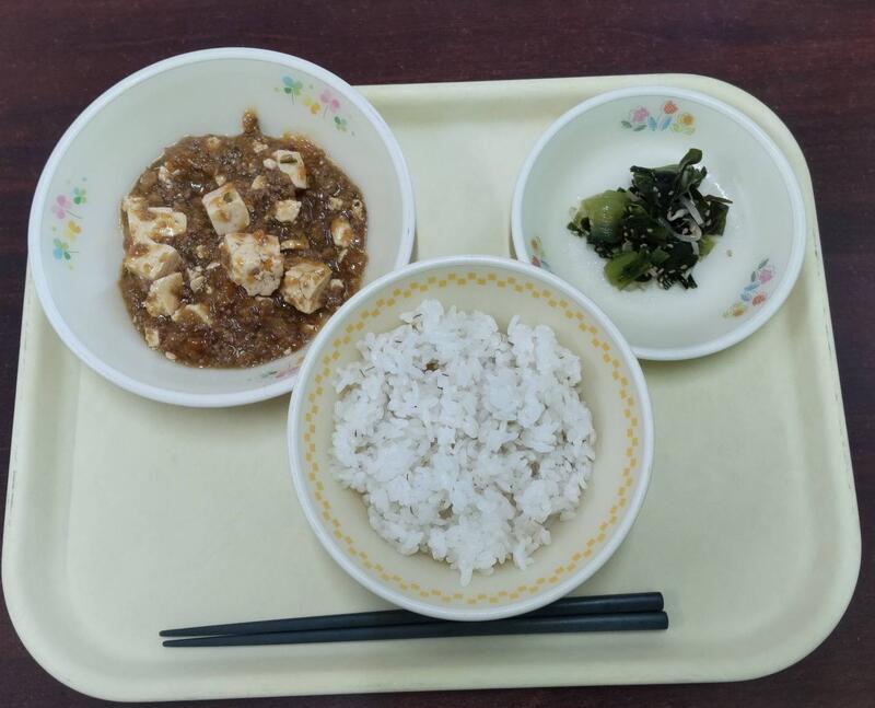 むぎごはん、牛乳、マーボー豆腐、チンゲン菜のナムルです。