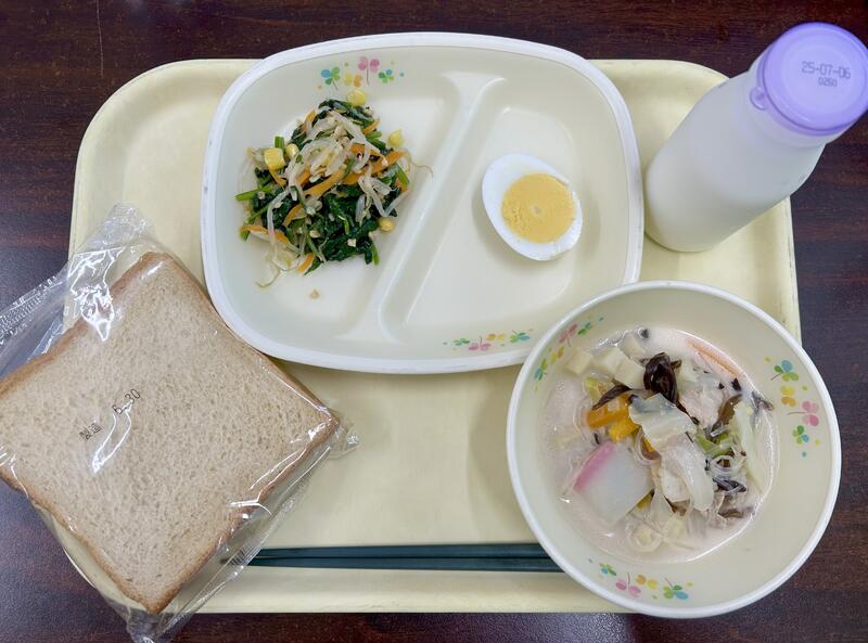 コッペパン、牛乳、白身魚のムニエル、大根の海藻サラダ、産山村のスイートコーン、
