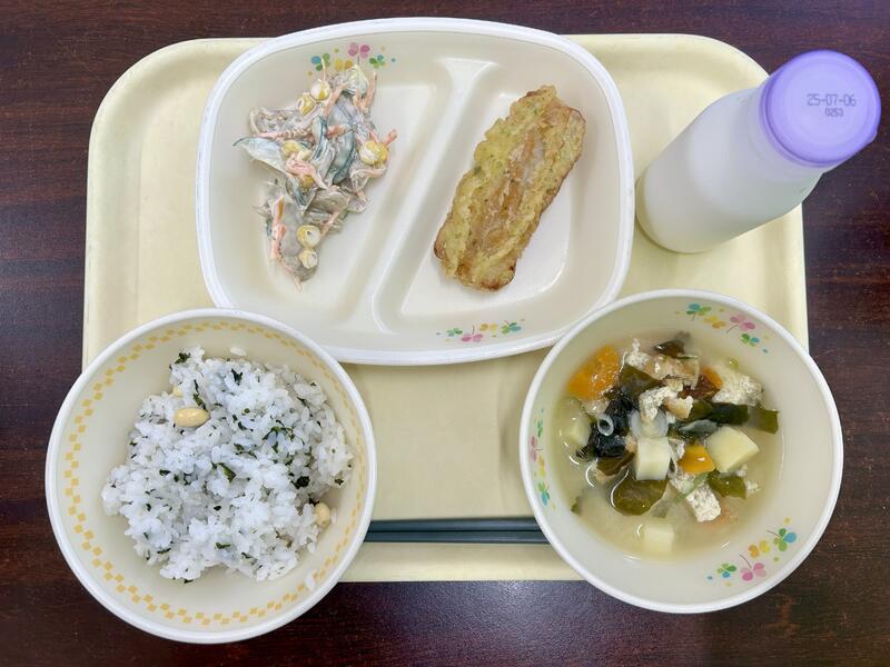 南関揚げ丼、牛乳、ほうれん草のごま和え、夏のっぺい汁です。