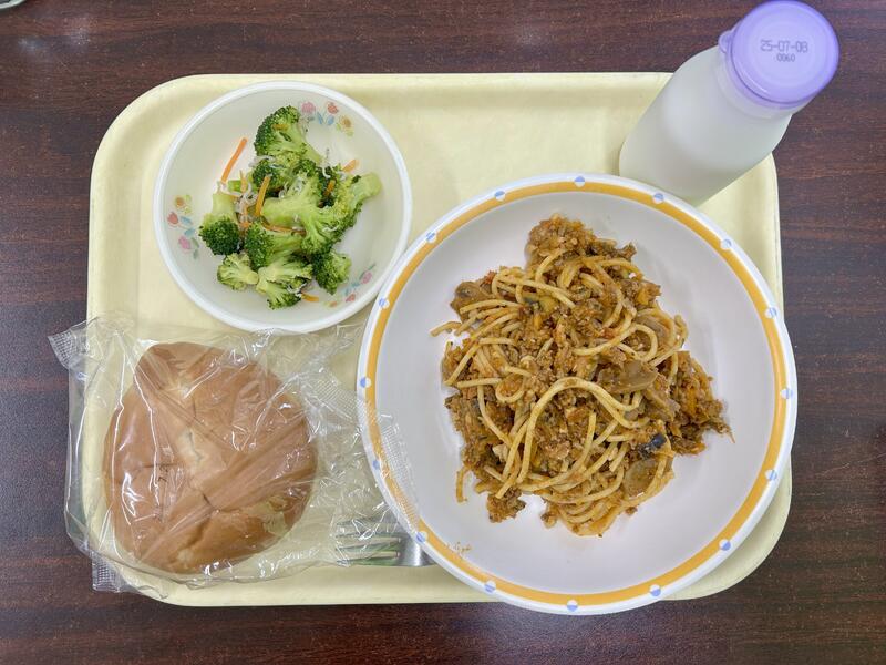 タコライス、牛乳、もずくスープです。今日は、九州の沖縄県のメニューです。