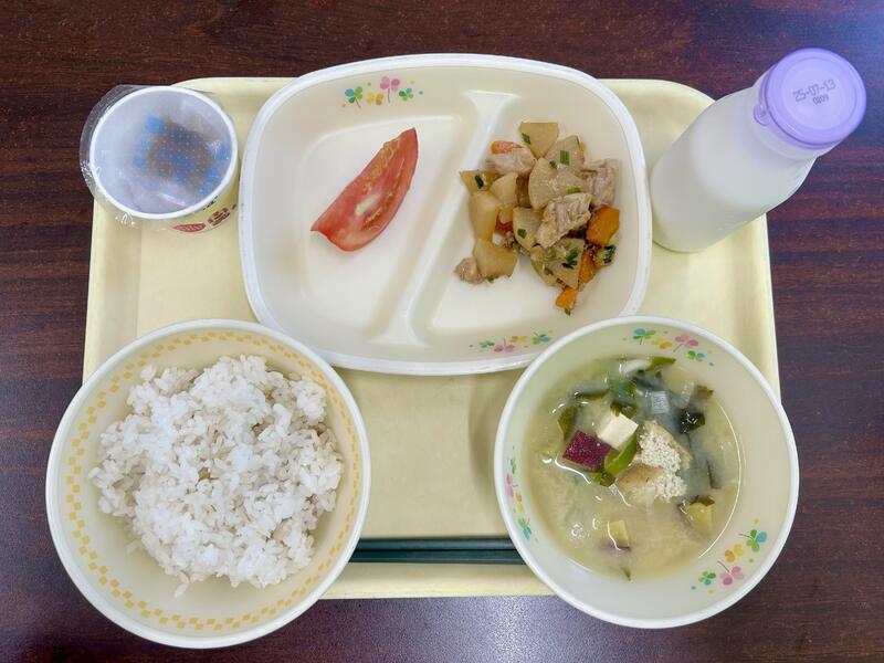 ごはん、牛乳、鶏肉と大根の照りに、納豆、産山のトマト、さつまいものみそ汁です。