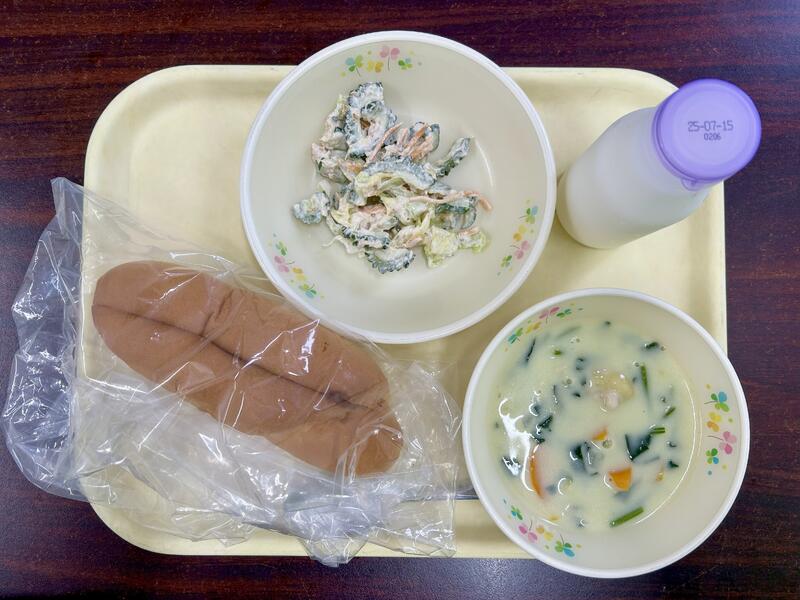 きなこパン、牛乳、ほうれん草のクリームスープ、ゴーヤのツナサラダです。
