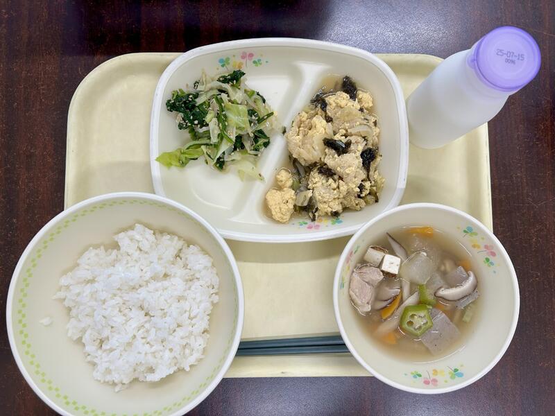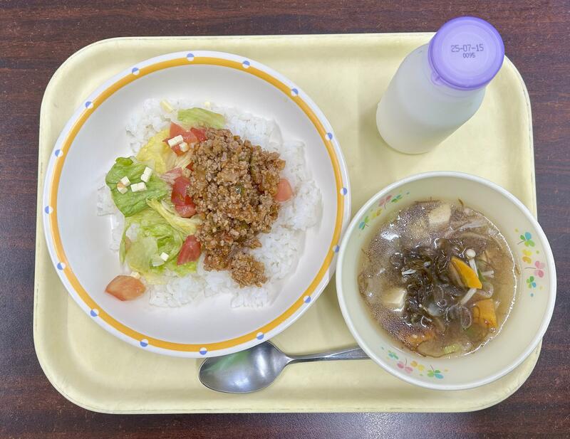 タコライス、牛乳、もずくスープです。今日は、九州の沖縄県のメニューです。